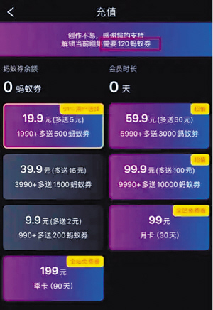 记者了解到,目前小程序上的微短剧主要有两种收费形式,一种是充值虚拟货币,进行单集付费,每集价格从几毛至几元不等;另一种是直接充值会员,包括周卡、月卡、年卡等。以某短视频平台的小程序为例,一部不到百集的微短剧,免费试看15集后,后续为付费集数,需充值至少七八十元才能全部看完。
