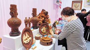 “刚刚有人订购了十件‘转运花冰壶收纳罐’,我和企业负责人还加了微信。”伊春市美江木艺有限责任公司创办人王美江告诉记者,“转运花冰壶收纳罐”以小兴安岭树木为原材料,以冰壶为原型,集收纳与观赏功能于一体,转动一下收纳罐就会呈现出一朵小兴安岭的杜鹃花。王美江告诉记者,他们公司已参加了20届哈洽会,每次在会上都有不小的收获。“展会期间,有很多采购商对这类大型艺术品感兴趣。”这次,王美江带来一个长1.1米、重200余斤的藏獒大型红松树瘿雕刻品,吸引了很多参展嘉宾来打卡拍照。