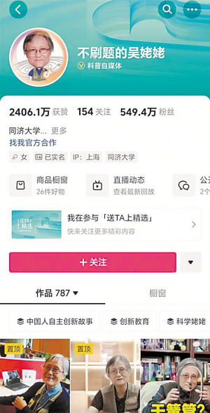 博主“不刷题的吴姥姥”是同济大学物理学退休教授,她借助身边常见的物件演示物理原理,如使用爆米花杯做飞行器、小硬币展示光折射现象、扫帚模拟宇宙射线轨迹,或是通过第一人称视角走进科普展会、实验室,让深奥知识“生活化”,吸引了大量求知欲强的年轻受众关注,当前粉丝超500万。