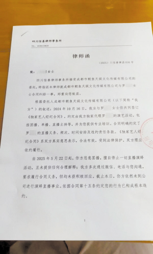 今年年中,不堪忍受的女主播集体离职。随后,她们陆续收到朝鱼公司寄来的律师函,称她们“恶意罢播构成根本违约”,可能因此承担20万元违约金。部分女孩被迫协商,赔偿了数千元。