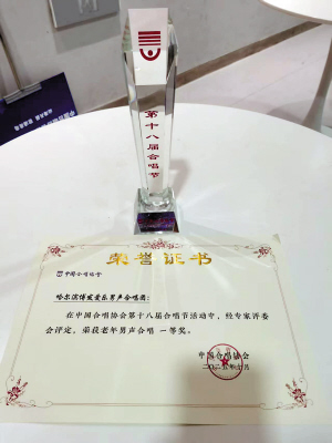 哈尔滨爱乐男声合唱团夺得中国合唱协会第十八届合唱节老年男声合唱一等奖。