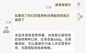对于产品是否能够满足住院老人所需,记者以消费者身份拨打“米麦奇”客服电话,一位詹姓负责人称,该营养餐是专门推给老人吃的,营养应该够用,因为它蛋白含量高,加的都是进口乳清蛋白,可以搭配牛奶或蛋白粉,也可以单独食用,“我们平时吃饭大部分的营养就是碳水和蛋白质”。