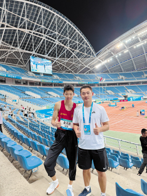 今年9月,朱天赐和教练许增仁前往北体国家训练基地进行为期10天的赛前集训。每天需完成1.5小时的训练,每周还要参与2—3次接力专项配合练习。“一想到能代表国家出征,就开心。”天赐说。亚青会男子异程接力采用100米+200米+300米+400米的赛制,朱天赐与福建的赖建光、浙江的林晓海、广东的杨嘉临时组队。尽管赛前仅配合训练了十余天,但他们在亚青会上一举夺冠,为国争光。