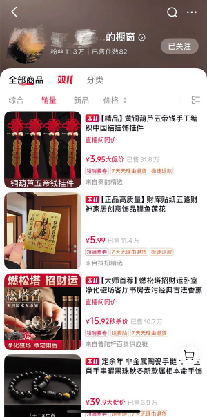此外,多名博主在视频中频繁推荐“改运”商品,如“山鬼花钱挂件”“三合六合手串”等,并引导用户进入其电商橱窗购买。部分博主还会在直播中展示“好运周边”,如木葫芦、小宝剑等,暗示观众“破霉运”需购买同款。