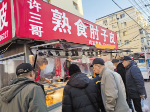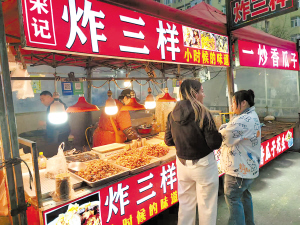 在宋记炸三样摊位前,一位正在等候美食出锅的姑娘说,自己是这里的常客。“炸三样”是哪三样?是腰子、鸡冠油和沙肝,咸香、酥脆的口感,颇受年轻顾客的喜爱。在一家主打芝士烤冷面、章鱼小丸子的摊位前,不少人在排队等候,光是章鱼小丸子就有番茄、沙拉、奶香芝士、芝士蛋黄、泰式甜辣五种口味,新意十足。