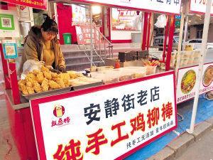 夜市的葱花饼也算是一绝,发面的鸡蛋饼、玉米饼、蟹棒饼等口味能满足不同食客,摊主称,最多一天可以卖出几百张。纯手工的鸡柳棒也是安静夜市上的一家老店,比巴掌还大的鸡柳棒外面裹着酥壳,一咬里面能流出汁水,老板说一天能卖一百多个。