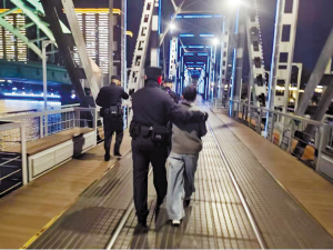 图片由公安机关提供 本报讯(记者 张智威)11月2日21时20分,哈尔滨市公安局中央大街治安巡逻队接到警情称,一名女子欲在中东铁路桥跳江轻生。
