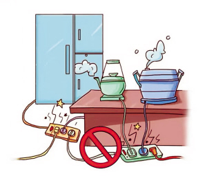 正确做法 大功率电器应使用独立插座,避免多个大功率电器共用一个插线板。不要使用老化的插线板,更要淘汰早已被明令禁止的万能插线板。