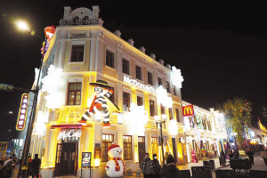换上“冬装”的麦当劳餐厅。 本报讯(王德宇 张佶 宋怀志 记者 张旭升 文/摄)11月7日立冬当天,麦当劳中华巴洛克餐厅换上“雪花冬装”,迎接冰雪季的到来。