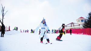 近日,在亚布力阳光滑雪场,“哪吒”和“敖广”脚踩单板俯冲而下,在雪道上灵活穿梭。这些国风装扮的滑雪爱好者齐聚雪场,灵动身影与皑皑白雪相映成趣,成了雪场上最吸睛的风景线。 高明泽 本报记者 王东/文 图片由受访单位提供