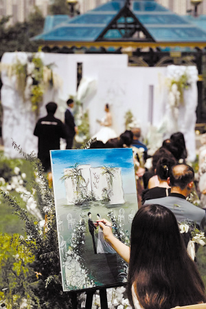 谈话中,记者感受到曹政的语气中带着满满的自信。“学美术的人,不一定要局限在画廊、学校这些传统场景。”曹政说,艺术应该融入生活,才能发挥更大的价值。婚礼现场绘画之所以能被市场接受,正是因为它精准击中了当代年轻人对个性化、仪式感的追求。现在的年轻人办婚礼,不再满足于千篇一律的流程,他们希望有独特的记忆点,而油画这种有温度、有质感的艺术形式,正好满足了这种需求。如今,还有客户还向她咨询宝宝宴、金婚纪念的现场绘画。