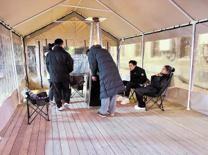 13日,在中华巴洛克历史文化街区靖宇街与北二道街交口附近,新近打造的“暖亭”亮相。“暖亭”面积约有30平方米,步入其中,中央的“暖炉”散发着暖意,方便游客御寒保暖。牛金梁 本报记者 杜菲菲 摄