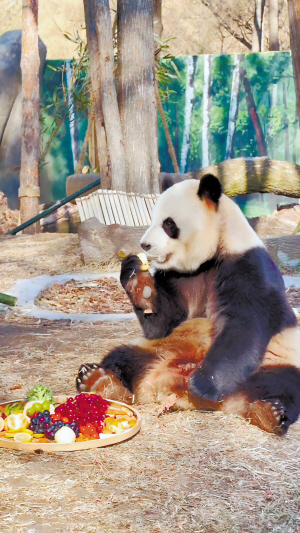 百日当天,园区特意为“芝士”“芝麻”准备了丰盛的水果餐。如今,这对双胞胎已完全融入太阳岛的生活,市民游客可前往太阳岛大熊猫馆,近距离感受国宝萌态,见证它们的快乐成长。