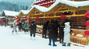 今冬新增年货大集,凭借浓郁年味与多元体验成为游客追捧的新晋打卡地。步入年货大集,大红灯笼挂满街巷,东北山珍、手工冻货、保暖用品整齐陈列,烟火气与年味扑面而来。“咱们年货大集是围绕着东北过年赶集的氛围打造的,货品主要有对联、灯笼、鞭炮、冻梨、冻柿子、瓜子、糖块等,让各地游客都能体验雪乡浓郁的年味。”据工作人员介绍,年货大集上,不仅汇聚了林区特色产品,更将演艺融入市集场景,让游客沉浸式感受“在雪乡过个东北年”的独特氛围。