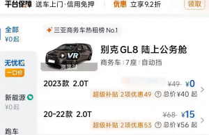 除了隐性收费,租车市场的“淡季竞价”也让价格跌破常规。记者注意到,在支付宝租车平台,朗逸车型租两天仅需40元(含基础保险)。海南某汽车租赁公司工作人员透露,国庆期间日均租金三四百元的GL8七座商务车,当前报价40元/日,相当于打了一折。“125元/天已经是亏本价了,每到淡季,生意就特别难做。”某大众迈腾租赁门店工作人员坦言,淡季降价是无奈之举。