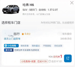 在支付宝租车平台首页,部分车型以红色醒目大字标注“日均0元”“日均1元”,但这些低价标识下方,还附有灰色小字标注的“总价”,两者差距令人咋舌。记者查询发现,一款哈弗H6车型标注“日均1元”,但总价最低需101元。价格明细显示,车辆租赁费经39元优惠后降至1元,而上门取送车费40元、基础保险费60元成为主要支出。若选择全额免赔服务,单日费用更是飙升至191元。
