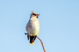 近日,哈尔滨野生鸟类摄影爱好者史敏捷在松北区绕城高速下桥口附近的湿地内抓拍到了一种叫太平鸟的漂亮鸟。“太平鸟非常漂亮,十分活泼,看着就招人稀罕!”史敏捷说,灰褐色的太平鸟,扮相很像“佐罗”,黑色的眼线延伸至头后,一撮冠羽立在头顶,显得十分精神。