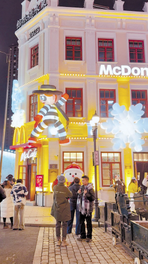 本报讯(记者 王坤 文/摄)暖黄色的灯光勾勒着中西合璧的建筑轮廓,雪花造型的灯带在冬夜亮起,百年老街在夜色中恍若“移动摄影棚”,每一步都是风景,每一帧都值得珍藏。