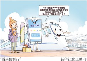 12月7日起至2026年雪季结束,铁路部门在京张高铁北京北至崇礼间各车站运行的G字头列车试点推出“雪具便利行”服务,铁路12306客户端同步上线“雪具便利行”功能,旅客线上预约成功后可随车携带雪具并存放在列车指定位置。