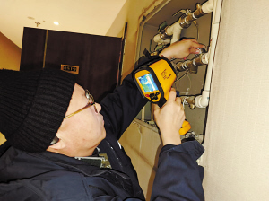 为精准破解难题,技术团队提前梳理小区管网布局与往年供暖数据,量身定制专项调节方案,携带测温仪、流量检测仪等专业设备逐栋楼、逐单元开展全面排查。“每栋楼供回水温度、压力都要精准检测,管网流量短板通过数据一目了然。”现场技术人员顶风冒寒,穿梭在楼栋之间,仔细记录每一组数据,为后续调试提供科学依据。在4号楼2单元调试现场,技术人员紧盯压力表数值,缓慢调节阀门。楼下的同事同步监测数据,楼上专人实时反馈室温变化。经过近50分钟调试,6楼住户家暖气逐步升温,王阿姨触摸到温热的暖气片。