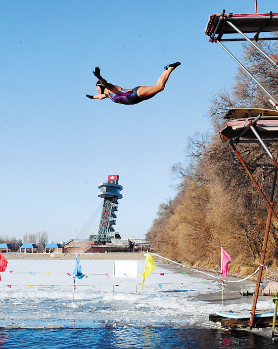 12月11日,一群冬泳爱好者在冬日的松花江中跳水畅游,展现出冰城冬泳健儿挑战严寒的勇气和魄力。 寇信 本报记者 刘洋 摄