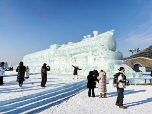 进入园区,首先看到的是两组火车冰雕。其中一个为“蒸汽火车”,该冰雕景观长42米、高6米。车轮与冰轨精巧衔接,让人仿佛看到列车驰骋在百年前的城市中。这座冰雕在冰雪天地中凝结成一部无声的历史长卷,既显现了哈尔滨城市文化的深厚底蕴,也铭刻着城市发展的初心记忆。另一个为“高铁动车”,该冰雕长46米、高5.3米。流线型车身与冰晶感巧妙融合,仿佛列车正疾驰在银装素裹的龙江大地上。作为中国高铁速度与北国冰雪风情融合的具象载体,这座冰雕在冰天雪地中勾勒出一幅灵动的壮美画卷,体现了城市奔向未来的坚定信念。