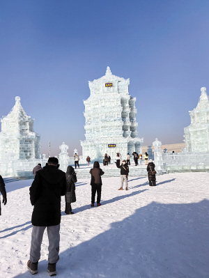 而在园区的雪墙上,蓝色也格外抢眼。高大的青花瓷雪雕,吸引着游客驻足。“不仅是冰能雕刻出伟岸的建筑,雪居然也可以雕塑得如此完美,真是太惊艳了。”湖南游客孙女士说。