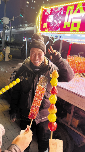 记者见到潘德军时,他正埋头给一串串山楂裹糖。糖浆金黄透亮,拉出细密的丝。五十三岁的他,话不多,笑容里有种吉林老家土地般的朴实。早年打工,后来帮人卖糖葫芦,再后来,自己推起了这小车。来哈尔滨两三年,从江南到江北,最终在师大门口扎下了根。“这儿学生多,热闹。”他搓搓手,“看着他们,就跟看自家孩子一样,得劲。”