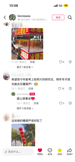 “想吃就拿着吧,孩儿!叔请你!”哈尔滨师范大学江北校区门口,初冬的风已经刮得有些“硬”了,一个裹着厚实棉服的大叔,从推车上利落地摘下一串糖葫芦——糖壳晶莹,裹着红艳艳的山楂,不容分说地塞进一个女学生手里。女孩愣住了,她今天根本没打算买。