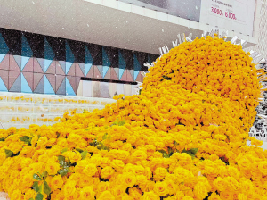 漫步于童话镇中,12处精心设计的打卡点依次展开:苍翠的松树上挂着晶莹的“冰凌”,“冰立方”花艺装置内封存着永不凋谢的玫瑰,憨态可掬的雪人似乎在向每位游客招手问候……每个场景都自成画卷,又相互呼应,形成完整的冰雪叙事。