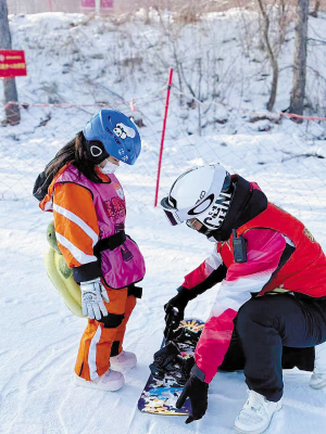 在雪具大厅里记者看到,整齐摆放着各种新款单、双板,还有漂亮的雪服和专业头盔等装备。有工作人员正蹲着为小朋友调整雪鞋,同时细心询问:“合脚吗?不合适就再换一双试试。”