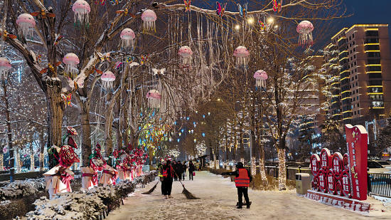 每当夜幕降临,哈尔滨街头通过精巧的灯饰小品、灵动的光影投射,将城市主街与辅街依次点亮,化身璀璨的“光影艺术殿堂”。本报记者 韩伟 摄