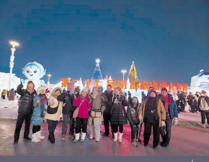东南亚旅游团游客在冰雪大世界合影留念。 □本报记者 于博洋