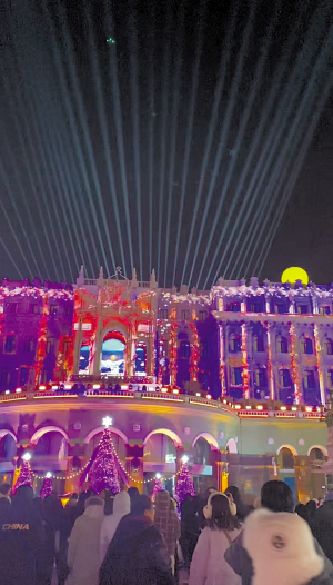 当夜幕降临,索菲亚广场附属楼化身天然幕布,索菲亚公主与冰雪王子的浪漫爱情故事在光影中串联起哈尔滨“欧亚风情、四季风光、冰雪盛景”。光影秀融合了墙体投影、激光演艺、IP人物与发光月亮等元素,更加注重沉浸体验和创意玩法,让观众在光影流转中邂逅哈尔滨的浪漫底蕴与活力新生。