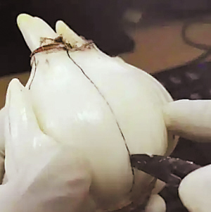 在水培水仙之前,如果不经浅层切刻,叶芽及花芽被鳞茎层层包裹,出芽受阻,一旦叶芽冲出鳞茎,叶片就会迅速生长,变得窄而长,成了“大葱”。所以,水培水仙应先摘掉鳞茎干皮和枯根,然后在茎顶主芽双侧的正反面进行浅层切刻,略加掰离,使鳞片松散一些,便于抽芽。经过这样处理的水仙才能出叶短阔,促进开花。