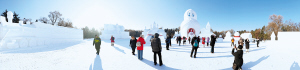 进入园区,坐龙广场与彩虹桥之间的《百福迎宾》雪雕作品率先映入眼帘。这座长30米、宽5米、高6米的雪雕以巨型卷轴形态舒展,用雪量达800立方米。