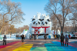 以“芝麻”“芝士”为原型的巨型熊猫雪雕——《太阳岛来客》成为“冰天雪地 诗情画意”核心主题的生动体现。这座雪雕长12米、宽9米、高13米,用雪量达1400立方米。只见两只雪雕熊猫相互依偎,黑白雕琢的轮廓细腻还原出它们的灵动神态,喜庆的面部线条搭配鲜红的围巾,以及共同捧着的心形装饰,为银装素裹的冰雪世界添上了温暖的色彩。雪雕后方,层叠的冰雪棱角如冰晶绽放,与熊猫的圆润线条形成刚柔并济的视觉效果,冰雪雕刻的巧思让这片雪地仿佛化作一幅立体的冰雪诗画。