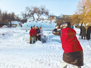 在花园街历史文化街区入口的文明实践服务点,南岗区橄榄绿退役军人志愿服务队的志愿者们身着统一服装,在严寒中始终面带微笑。“您好,需要帮忙吗?”“往前走再右转就是打卡拍照的冰雕群。”他们一边为游客画简易路线图,一边递上街区导览手册,上面用彩笔标注了俄式餐厅、咖啡厅等特色商铺的位置。
