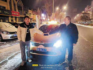 邹洪滨与李先生。 本报讯(实习生 李玉鑫 记者 黄晏君)“太感谢邹师傅了,这么快就把我落在车里的手机送回来。”12月28日零点左右,在群力玫瑰湾小区门前,市民李先生从飞达实业公司雷锋车队队长、五星驾驶员邹洪滨手中接过自己遗落车上的华为折叠手机。