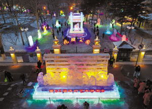 58岁的市民陈女士带着3岁的孙子来看冰灯,她指着不同的冰雕作品,给孩子讲述冰灯的制作过程和背后的故事。陈女士的家就在兆麟公园附近,哈尔滨的冰灯艺术发展几乎伴随着她人生的整个历程。“我从小就在兆麟公园看冰灯,现在每年都来这儿,已经成了冬天必做的事情。”陈女士说,今年特意带着孙子前来,就是希望让孩子在亲身体验中,感受家乡的冰雪传统文化。“看着孩子好奇地触摸冰雕,仿佛回到我小时候父母带我来游园的时光,冰灯是东北孩子刻在骨子里的家乡记忆。”在陈女士看来,冰灯游园会不仅是一场视觉盛宴,更是哈尔滨人心中不可替代的情感寄托。