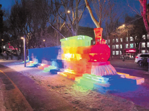 据相关负责人介绍,位于公园东门处的冰雕,以儿童铁路第六代小火车为原型,采用1:1复刻工艺,精细还原了火车车头及首节车厢的造型。记者看到,冰雕火车线条流畅、细节生动,在灯光映照下晶莹剔透,将工业时代的机械美学与冰雪的灵动清澈融为一体,让观者仿佛能感受到小火车穿梭往昔的活力,沉浸式体验哈尔滨浓厚的冰雪文化氛围。