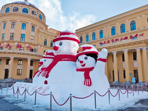 本报讯(记者 霍亮 文/摄)戴着红帽子、红围脖,笑脸盈盈挥小手——日前,南岗区中山路工人文化宫路段迎来3座大雪人,憨态可掬的模样迅速吸引市民游客驻足合影,成为冬日街头又一热门景观。
