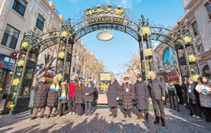 嘉宾们在百年老街中央大街合影留念。 本报记者 韩伟 摄 □本报记者 孙伟 徐光胜
