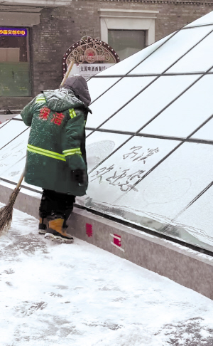 1月13日15时左右,记者在中华巴洛克历史文化街区大舞台附近找到了这位62岁的保洁大哥李龙侠。据了解,他是旭生物业公司的保洁员,负责玻璃房周围的清扫工作。说起12日当天那一幕,李大哥眼里一直闪着光:“当时正下着雪,我看到好多南方游客玩得那么开心,我自己心里也非常高兴。我从小就爱写毛笔字,那玻璃上铺了一层积雪,就好像天然的纸,我就随手写下了那句话。那真是我的心里话,我就想让他们在哈尔滨玩得高兴!”