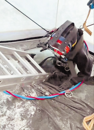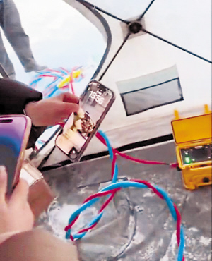 李先生告诉记者,13时40分,他拿出手机拍摄钓获的鱼时,因为手滑,手机顺着冰眼掉入水下。情急之下,李先生叫来钓场负责人,借助探鱼器查找手机踪迹。探测结果显示,手机沉在两米多深的水下,常规的网具和抄网根本无法触及。若用强磁吸附手机,又极易损坏手机部件。为帮李先生找回手机,钓场负责人随即联系了一名潜水员。为方便潜水员下水作业,众人合力将冰面的冰眼扩至直径约一米左右。做好准备后,潜水员扶着梯子潜入水下,仅用两三分钟,就将李先生的手机打捞上岸。