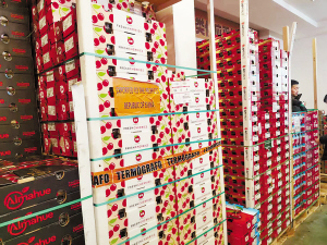 13日上午,记者在龙园批发市场看到,尽管已经过了批货的高峰时间,但市场里仍有小型叉车在运送车厘子。走进“熊喵商贸”,前来批货的商户络绎不绝。