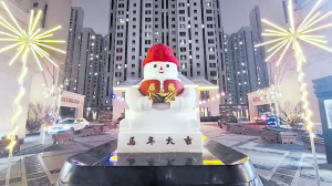 在道里汇龙外滩首府小区门前,记者看到一个头戴红帽、身披中国风坎肩、高约2.5米的大雪人,它胸前两枚“福”字喜气洋洋,底座“马年大吉”四个红字格外醒目,不时吸引过往业主在此打卡拍照。