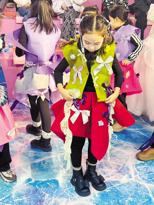 10时15分,“我的冰雪霓裳”创意工坊在7楼青创汇开启。哈尔滨学院艺术与设计学院服装与服饰设计专业教师鲁晓龙带领团队,早已备好材料。他介绍:“我们从专业角度辅导孩子制作时尚单品,培养他们的审美意识。团队将服装结构简化为剪纸形式,引导他们用环保材料进行装饰,充分发挥创造力。”