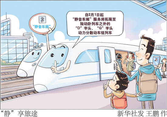 记者从中国国家铁路集团有限公司获悉,自2月1日起,“静音车厢”服务将拓展至除动卧列车之外的“D”字头、“G”字头动力分散动车组列车,届时全国铁路提供“静音车厢”服务的列车将增至超8000列,更好地满足广大旅客对美好旅行生活的需求。