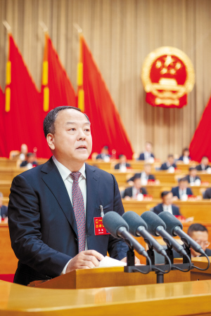 孙喆向大会作哈尔滨市人大常委会工作报告。 本报记者 赵亮 范子龙 摄 本报讯(记者 尹明)1月22日上午,市十六届人大六次会议在哈尔滨国际会议中心环球剧场举行第二次全体会议。